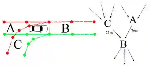 图 5:自动车辆项目 [BEN14] 使用的 lanelet(车道片段)地图的图模型。红色和绿色点分别表示车道片段 A、B、C 的左和右路沿。该图展示了 A 和 C 交汇成 B 的情况。