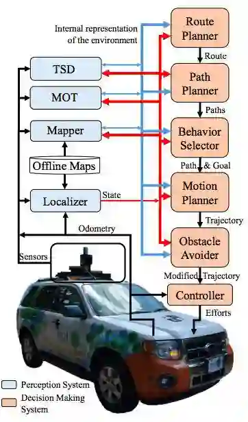 在这一节,我们将给出自动驾驶汽车决策系统文献中报告的相关技术,包含路线规划、行为选取、运动规划和控制子系统。
