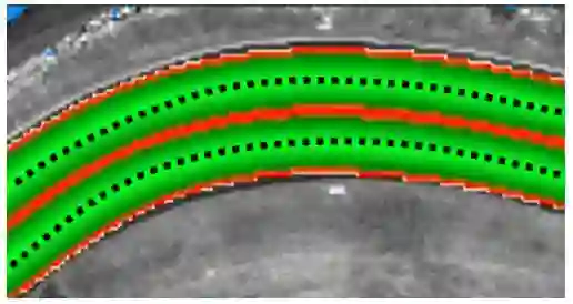 图 4:无人驾驶汽车 IARA 使用的道路网格地图和 RDDF 路径。绿色和红色区域表示道路网格地图,黑点是 RDDF 路径点,这是从道路网格地图中自动提取出来的。