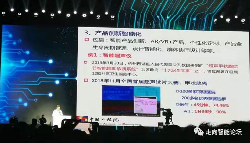 产品创新智能化。包括智能产品的创新,AR/VR+产品、个性化定制等,有很多内容,在工业智能化中都可以进行。我想举的一个例子是浙江大学研制的智能超声仪,今年3月份西湖区人民政府人大代表进行投票,评选区政府“十大民生实事”,最后浙江大学孔教授研究的超声甲状腺智能辅助诊断系统被评为“十大民生实事”之一,因此西湖区就把这个设备部署在12家卫生单位。大家知道人工智能用于医疗上面,读片是一个很重要,而且很广泛的应用。孔教授研究的这个软件曾经参加中央电视台,和全国优秀医生进行比赛过,有100多家顶级医院医生参加,最后比赛的结果,医生花了45分钟读片,准确率74.46%。孔教授软件花了1分36秒时间,准确率达到90%。