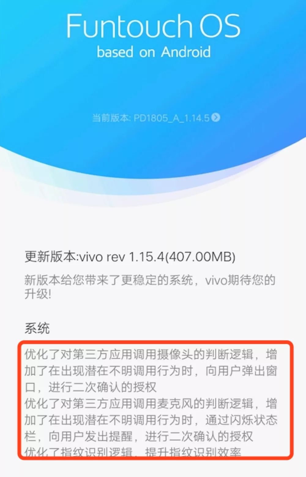 尽管如此,vivo NEX 迅速反应,在周五发布系统更新。新版本优化了第三方应用调用摄像头的判断逻辑,将在出现不明调用行为时通过弹窗向用户请求授权;在第三方应用调用麦克风方面,新系统也进行优化,将在出现不明调用时通过闪烁状态栏提醒用户。