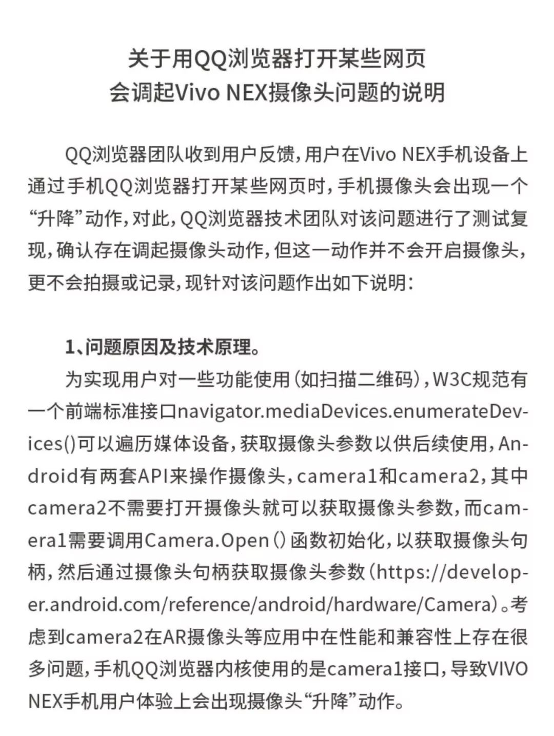 周四下午 QQ 浏览器从技术角度给出了回应,他们表示程序会寻找手机中所有的摄像头,获取摄像头参数以供后续使用。在获取摄像头参数时,QQ 浏览器在Android 提供给开发者的两套摄像头 API 中选择了兼容性更好的 camera1,此行为用户端导致了“升降”动作。此外,该团队强调,vivo NEX 摄像头在这个过程中没有完全弹出,也没有做任何拍摄或采集行为。