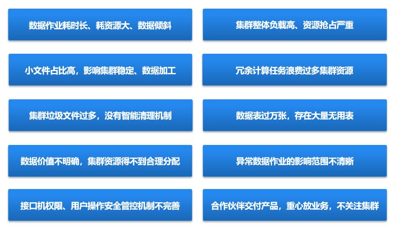 管理类:集群接口机权限管控、数据表不合理创建和删除、垃圾数据表过多问题。这类问题,可以通过数据治理工程进行持续改进,但是解决时间周期以年为单位。