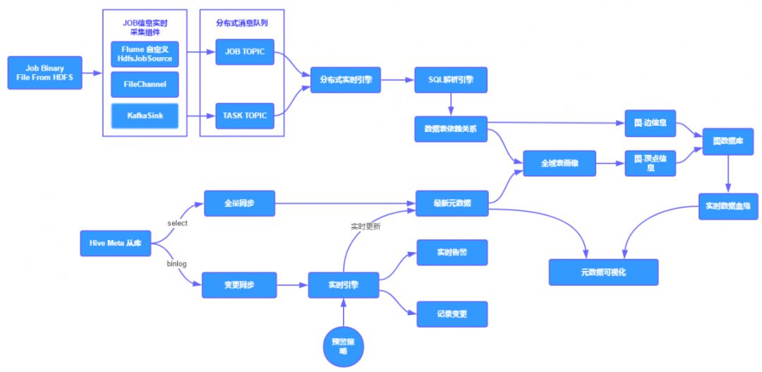 基于以上痛点,着手重构了企业级全域元数据平台,提供全域物理视图、业务视图、元数据变更跟踪监控、全域数据血缘关系图等核心功能。