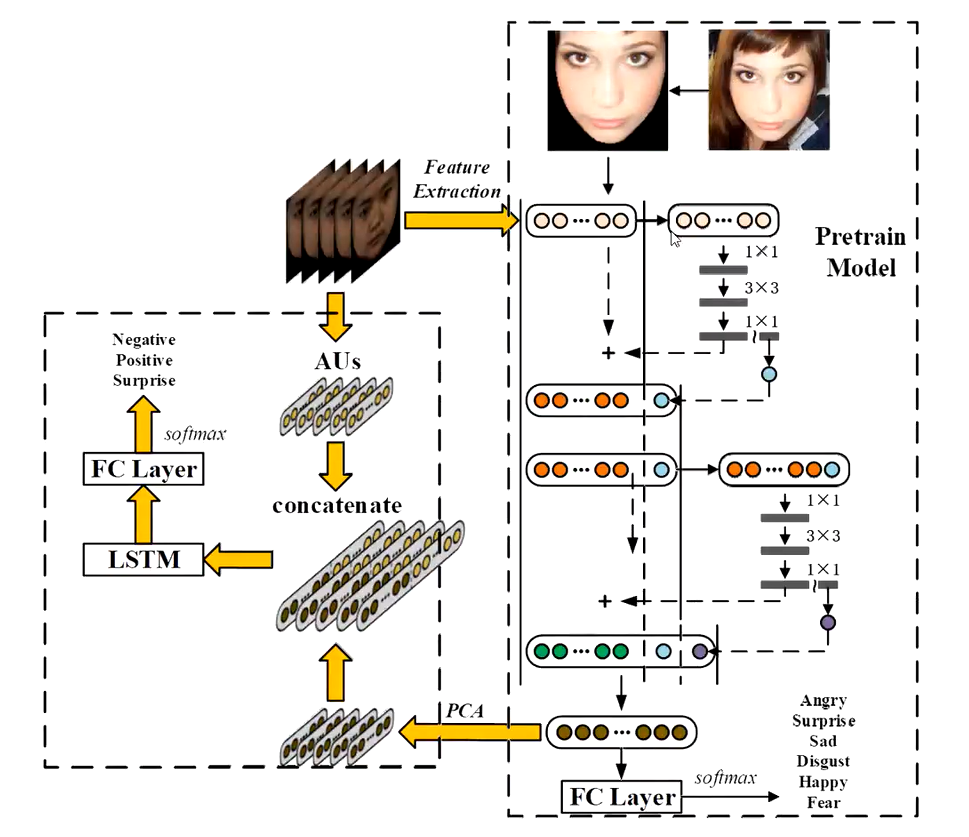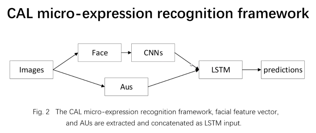 在简要介绍了目前主流的微表情研究方法以后,郑仕鑫同学介绍了他们提出的CAL微表情识别网络,微表情样本分别通过AU特征提取和基于CNN的人脸特征提取,融合后进入LSTM网络进行最后的情感分类。