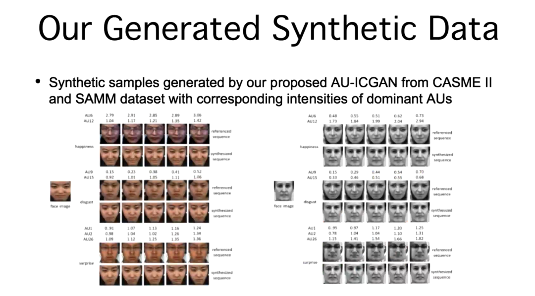 谢洪霞首先回顾了由中国科学院心理研究所王甦菁博士参与组织的三届微表情挑战赛(MEGC2018, 2019, 2020)和目前发展自动化微表情识别面临的局限,即标注的样本量少的问题。她接着介绍了通过可控人脸动作单元(Action unit, AU)强度的对抗生成网络(AU-ICGAN)生成微表情样本的方法,该方法为微表情识别挑战赛提供大量的训练样本。下图分别为AU-ICGAN和生成样本示例。