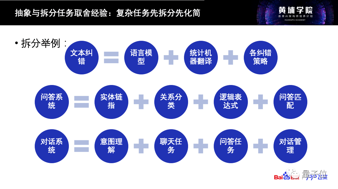 当遇到复杂场景的问题时,将其拆分成一些小的任务与目标。因为小的任务相对简单一些,而复杂任务相对难一些,把复杂任务拆分成小任务本身就是一个技术建模的过程。拆分成小的任务之后,针对每一个小任务,我们都可以进行非常细致的技术选型。