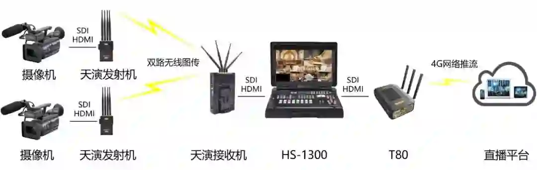 此方案也拥有良好的扩展性,HS-1300 支持6路视频源输入,可以再接入有线或其他视频源输入,支持更多机位的现场EFP直播任务。天演双路图传可通过RS232或RS422接口支持对云台摄像机的远程控制。