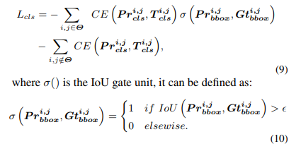 既只有回归框和真值框达到0.5的重合时分类才在该点产生loss,从而达到自动学习ignore范围的作用。用公式表达就可以写成: