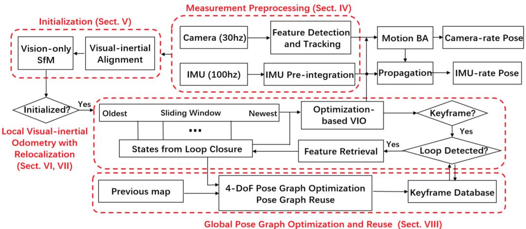 初始化估计器后,由基于滑动窗口的紧耦合单目VIO来实现准确并鲁棒的状态估计。