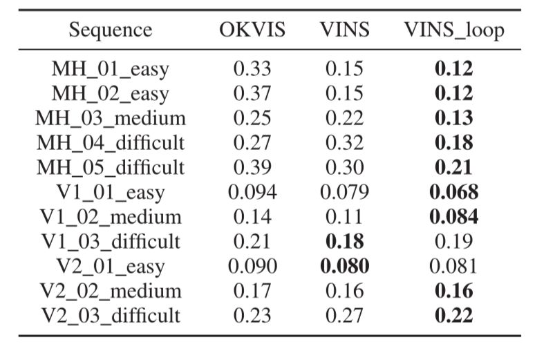 表1总结了OKVIS,VINS不带回环检测以及VINS带回环检测三种方法在EuRoC数据集下15个数据子集的结果。