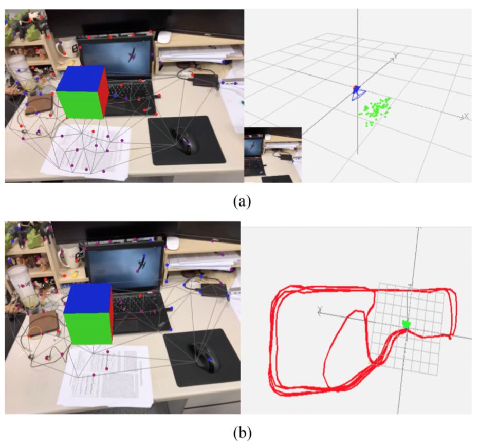 图5 左图是VINS-Mobile的AR应用图片,右图是估计轨迹。(a)开始:VINS-Mobile在开始位置初始化且一个虚拟盒子被放置在平面上。(b)结束:VINS-Mobile最终轨迹,总长约264米。