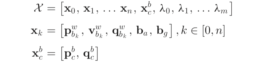 其中,x_k表示拍第k帧图像时的IMU状态,包括位置、速度、世界坐标系下的IMU方向以及IMU坐标系下的加速度计和陀螺仪的偏移。n表示关键帧的数目,m表示滑动窗口中的特征总数。λ_l是第l个特征的逆深度。x^b_c表示相机在IMU坐标系下的位姿。