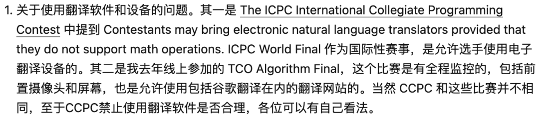 有的人认为,既然是英文题目,那理解题目也是参赛过程的一部分;有的则认为,用word翻译题目只不过是为了更快速地理解而已,无伤大雅,如果规则中明确禁止,不用便是了,毕竟这是个程序设计竞赛,又不是英文竞赛……