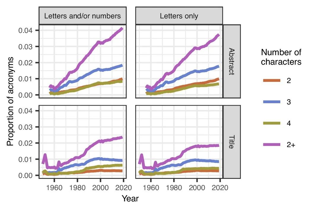此外,研究还发现,在最近的论文中,不仅使用了新缩略词的数量变多了,而且其标题和摘要的总长度也大大增加。