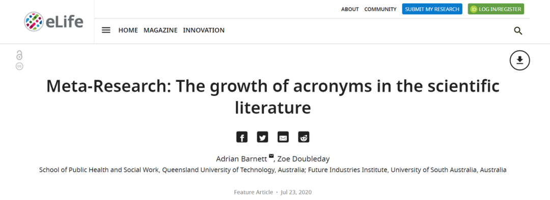 发表了题为 Meta-Research: The growth of acronyms in the scientific literature 的论文,报告了对 1950 年至 2019 年之间发表的超过 2400 万篇文章标题和 1800 万篇文章摘要的分析结果。