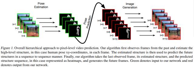 本文由谷歌大脑、Adobe和密歇根大学联合发表,文中介绍了一个层次(Hierarchical)方法预测长时(long-term)视频未来帧。模型先估计输入视频帧的高阶结构信息,再预测此信息如何在未来视频帧进化,最终给定一个单帧图像和预测得到的高阶结构信息,来重构未来视频帧像素级别的信息。文中提出的模型使用LSTM预测视频结构信息,和一个Analogy-based encoder-decoder CNN产生未来视频帧。其预测性能在Human3.6M和Peen Action datasets数据集上均取得了很好结果。