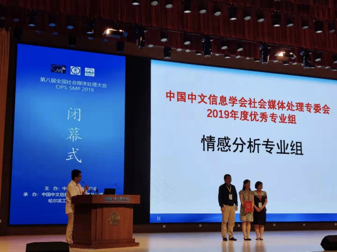 大会评选出了2019年度的优秀的团体和个人,并作出表彰。2019年度的优秀专业组奖项,颁发给了情感分析专业组。哈尔滨工业大学(深圳)的徐睿峰和山东大学的陈竹敏,获得2019年度的优秀组织奖。