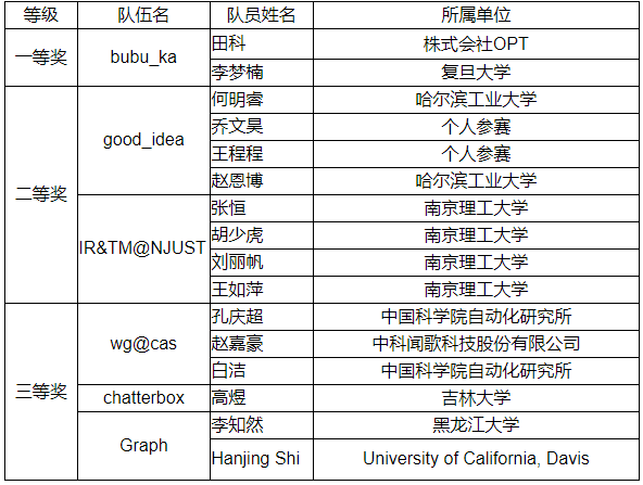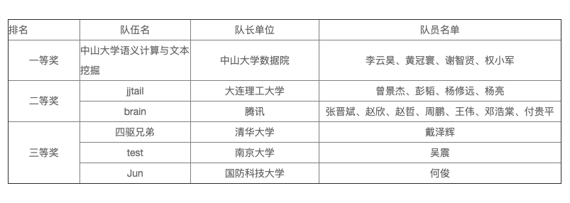 “拓尔思杯”中文隐式情感分析评测获奖情况: