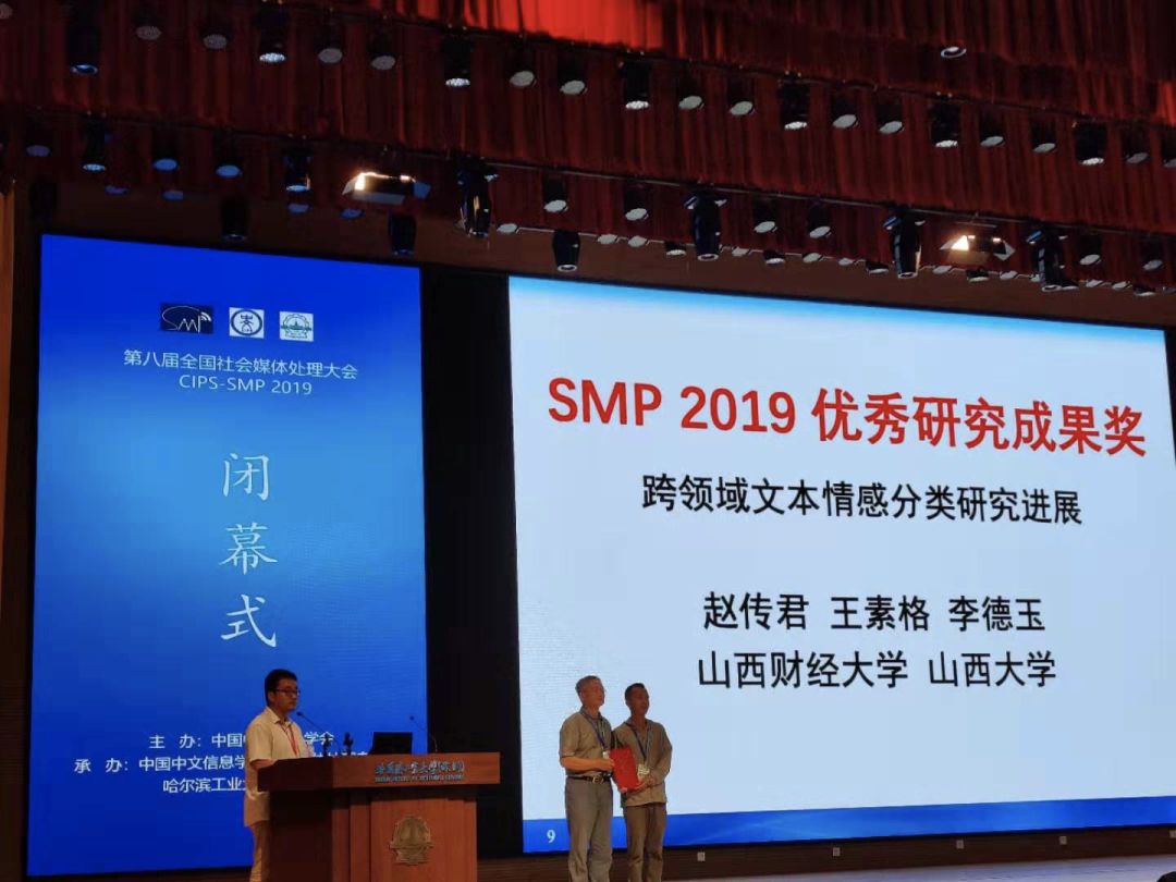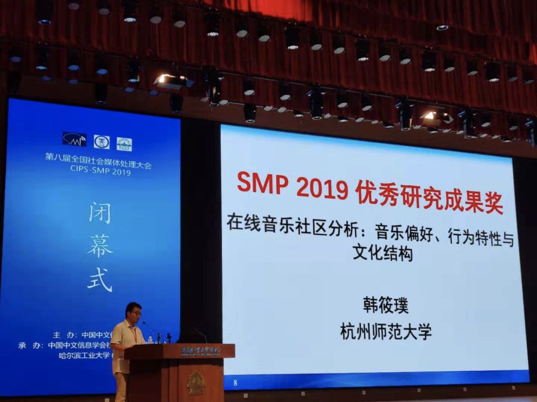 大会组织了多个研究项目的口头报告,评选出两个优秀研究成果奖,分别颁发给了来自于杭州师范大学的韩筱璞的《在线音乐社区分析:音乐分析、行为特征与文化结构》,以及来自山西财经大学和山西大学的赵传君、王素格、李德玉等人的《跨领域文本情感分类研究进展》。