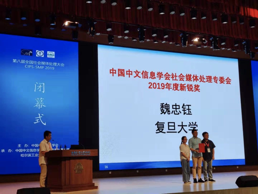 中文信息学会社会媒体处理专委会今年还首次评选出了年度新锐奖,奖励加入专委会一年以上、32岁以下在社会媒体处理领域做出极具特色研究的青年学者。复旦大学的魏忠钰,获得2019年度新锐奖。