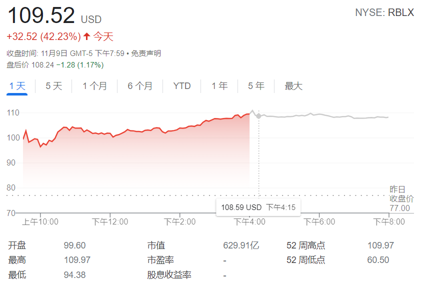 受财报消息影响,Roblox 股价飙升42.23%,收于每股 109.52 美元。