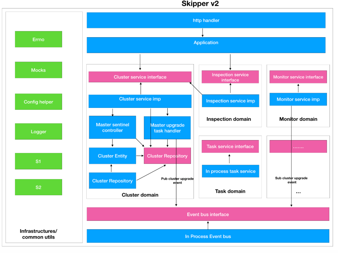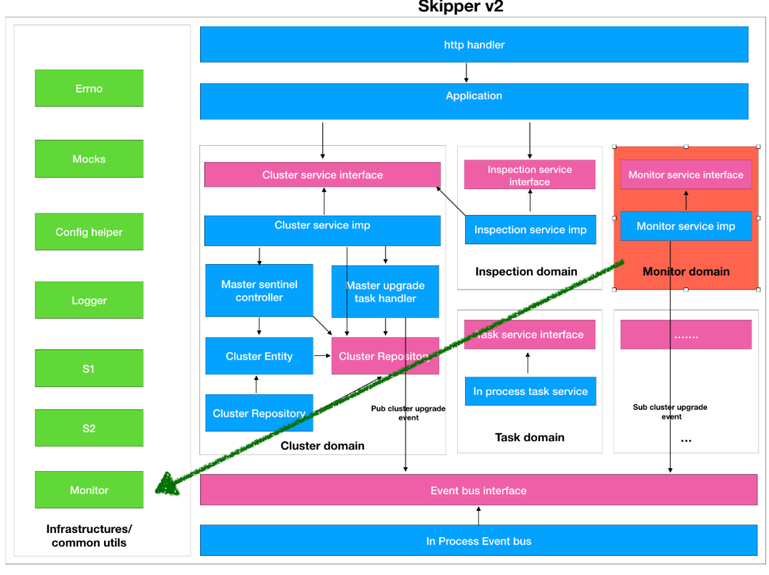领域可以定义事件并发布到事件总线,如果对某个领域事件感兴趣,就可以订阅事件。领域事件可以大大降低各领域间的耦合,且对系统扩展性有巨大好处。例如在 Skipper v1 中,如果划分出了集群监控领域和集群生命周期管理领域,当有一天监控领域决定去掉集群升级过程中对监控配置文件的修改,需要在集群升级代码里找调用监控配置文件升级的地方。而如果采用了领域事件,则只需要让集群生命周期模块发布升级完成事件,并让监控模块订阅或者取消订阅事件进而做出配置文件修改逻辑即可。