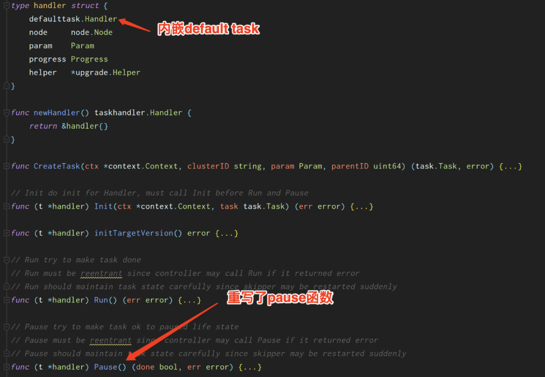(4)不要覆盖包含具体实现的函数,即别重写,在 Skipper v1 的 Task 模式中违反了这一条,因为 Task 模式为了减少代码重复,所有 Task Handler 都需要内嵌 Default Handler,并重写其觉得需要修改的函数。