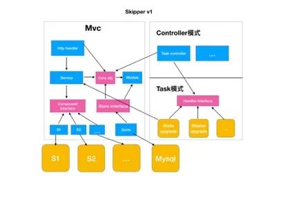 基于 Dashboard 存在的问题,我们设计了 Skipper 项目架构的 v1 版本,这个版本依然使用 MVC 分层,但是针对 Dashboard 的问题,重点关注了外部依赖接口化、DB 依赖接口化、充血模型、Task 异步流程、模块划分等。Dashboard 到 Skipper v1 的架构变动如下图。