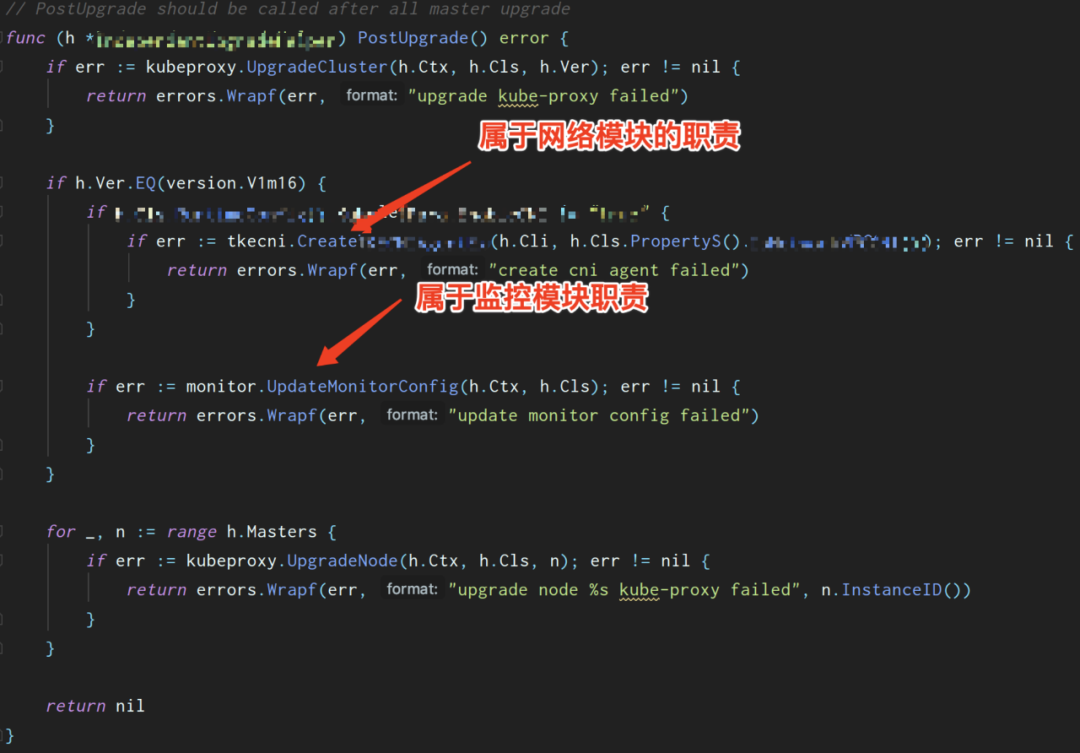 这里的行为者是指一个或多个有共同需求的人。从我们的实践背景下,集群生命周期模块和监控模块是不同的小团队在维护,而 skipper v1 中,监控模块想支持集群升级时更新配置,却需要改动集群生命周期模块代码,这其实就违反了 SRP。