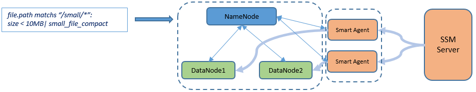 另外值得一提的是SSM针对小文件也有相应优化手段,这个功能仍然处于开发过程中。大体逻辑是SSM会对HDFS上一系列小文件执行合并成大文件的操作,同时,在SSM的元数据中记录下原始小文件和合并后大文件的映射关系以及每个小文件在大文件中的偏移量。当用户需要访问小文件时,通过SSM特定的客户端(SmartClient),根据SSM元数据中的小文件映射信息,从合并后的文件中获取到原始小文件。