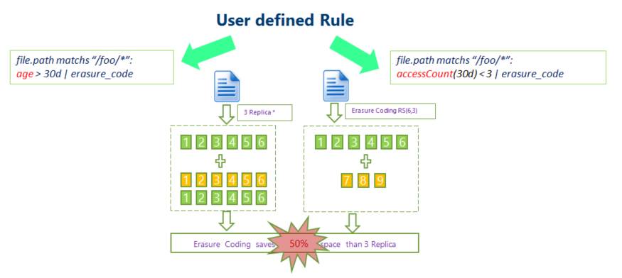 针对冷数据的场景,SSM也可以采用纠删码的优化,通过定义相应规则,对于访问次数很少的冷数据,对其执行erasure code操作,降低数据副本冗余。