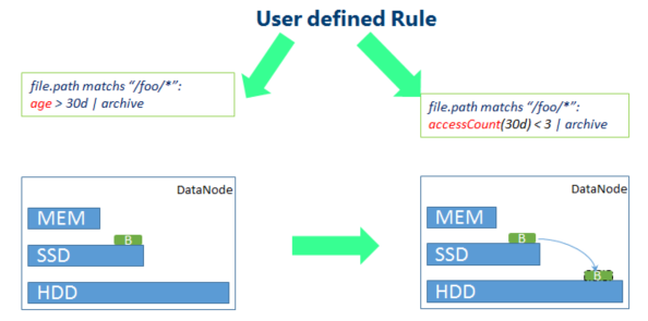 最典型的场景就是针对冷数据,如上图所示,定义相关规则,将较长时间为没有访问的数据采用更低成本的存储。例如原先的数据块,从SSD存储退化到HDD存储。