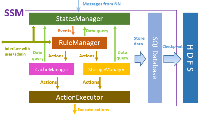 SSM-Server的主要框架如上图所示,从上到下,StatesManager与HDFS集群进行交互,用于获取HDFS元数据信息,并维护每个文件的访问热度信息。StatesManager中的信息会持久化到关系型数据库中。在SSM中采用TiDB作为底层存储的数据库。RuleManager维护和管理规则相关信息,用户通过前台界面为SSM定义一系列存储规则,RuleManger负责规则的解析和执行。CacheManager/StorageManager根据热度和规则,生成具体的action任务。ActionExecutor 负责具体的action任务,把任务分配给Agent,并在Agent节点执行。
