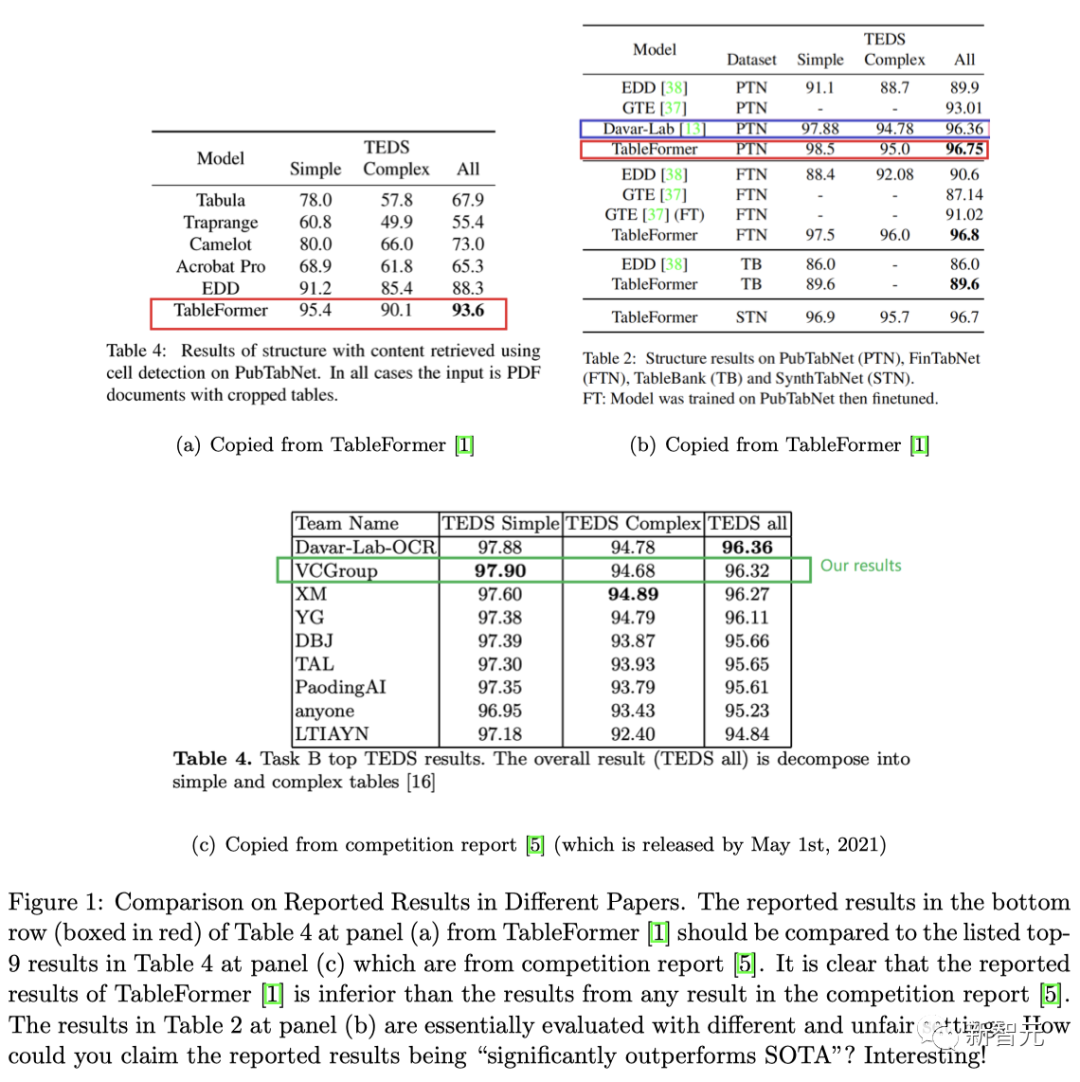 可以看出,(b)中表的2在性能评估的设置上并不公平。具体来说,(c)中表4所有结果都是针对整个表的内容进行评估的,包括表的结构和内容;而(b)中表2的TableFormer和其他结果,除了Davar-Lab,都是针对表的结构进行评估的。把它们混在一个表中,是对性能的比较是一种误导。