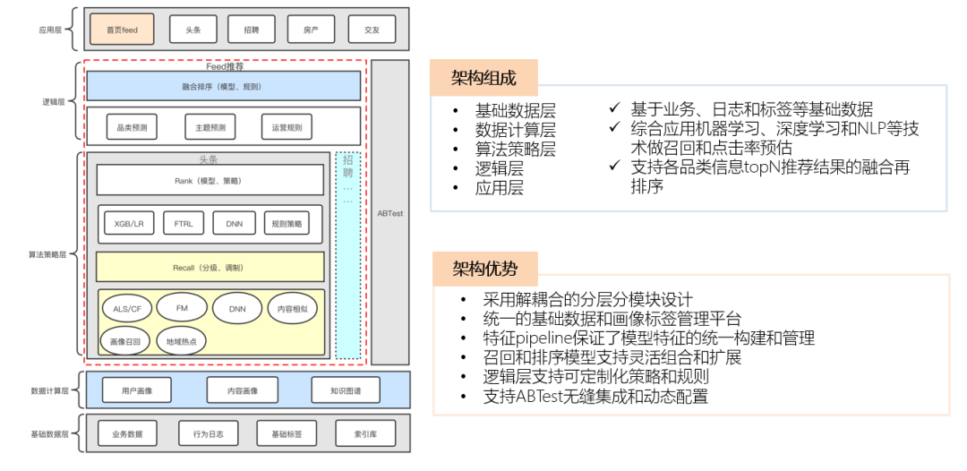 同镇推荐系统整体架构,主要包括:基础数据层、数据计算层、算法策略层、逻辑层和应用层。