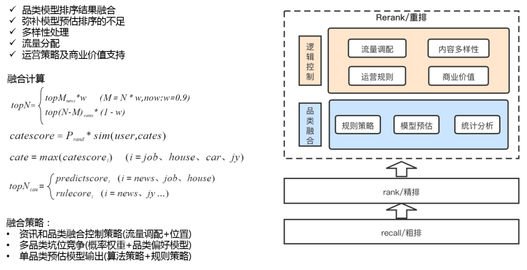 同镇推荐的重排阶段细分的话大概包括两部分:一是品类融合模型,二是逻辑控制层。