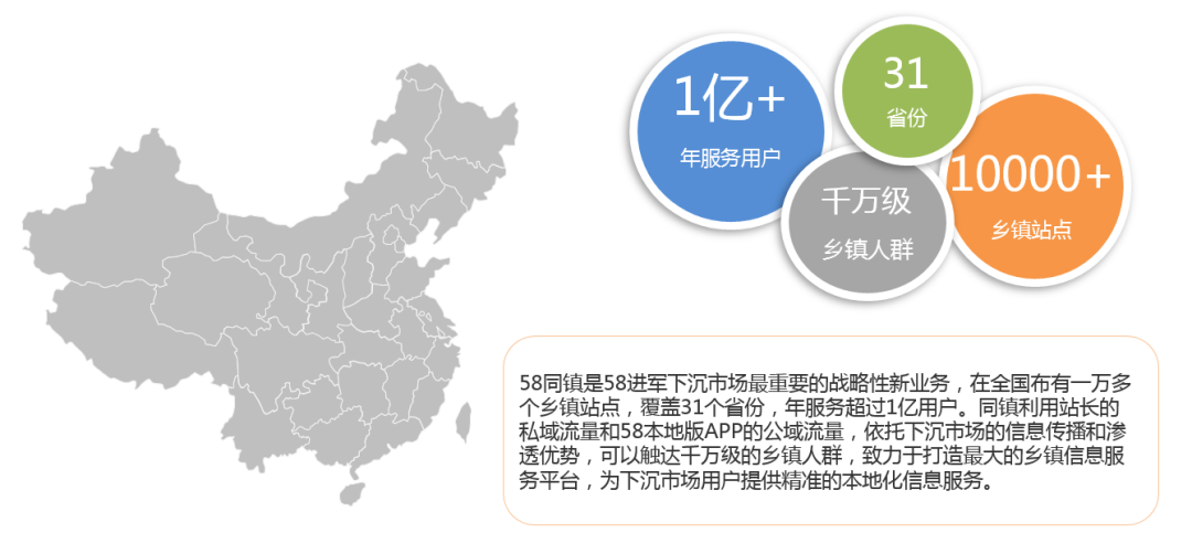 同镇是58集团进军下沉市场最重要的战略性新业务。下沉市场的概念也一直是近年来的热点话题,而同镇实际面向的是更为下沉的县域和乡镇市场。目前在全国布有一万多个乡镇站点,覆盖31个省份,年服务超过1亿用户。同镇利用站长的私域流量和58本地版APP的公域流量,可以触达千万级的乡镇人群,致力于打造最大的乡镇信息服务平台,为下沉市场用户提供精准的本地化信息服务。