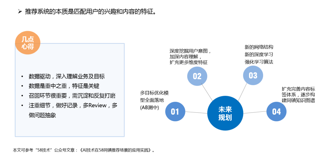 推荐的核心是要对用户的兴趣进行建模和预测,所以用户画像标签很重要,后续会继续挖掘和扩充,另外,需要进一步通过NLP技术来加强文本内容挖掘,加强内容理解。并最终为算法提供更多更好的输入。