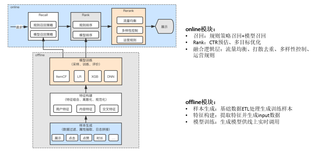 由此可见,数据和特征是重中之重,我们的数据主要包括业务数据、行为日志和标签数据。用户行为数据主要来源于埋点日志,分为显性反馈和隐性反馈两种。原始数据经过清洗、样本采样、特征组合、特征离散等特征工程的处理,最终形成训练样本并作为模型的input。