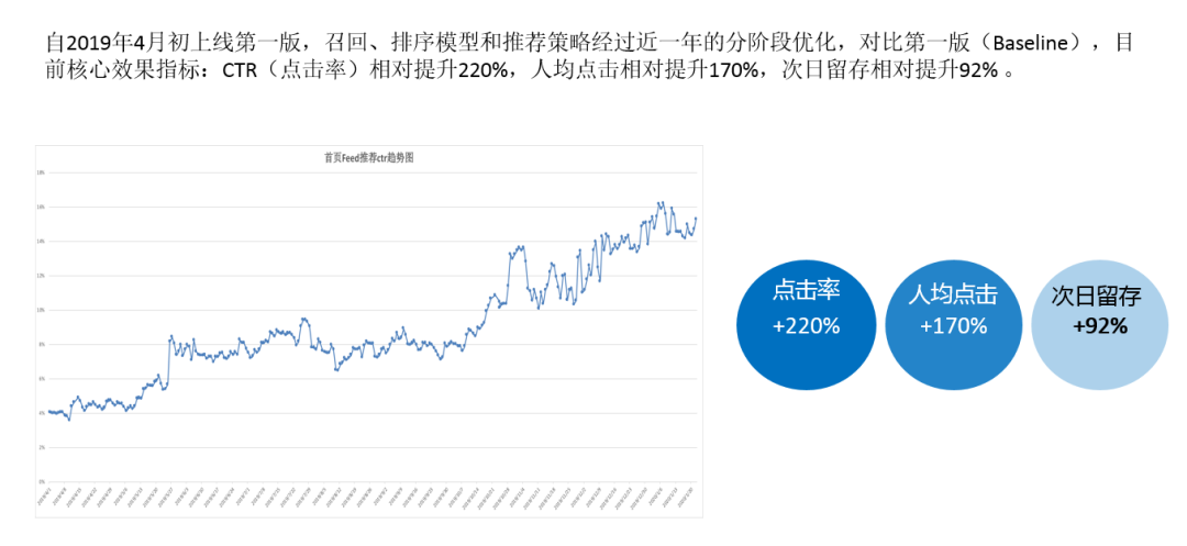 自2019年4月上线第一版,召回、排序模型和推荐策略经过近一年的分阶段优化,对比第一版 ( Baseline ),目前核心效果指标:CTR相对提升>220% ( x%->y% ),人均点击相对提升170% ( x->y ),首页Feed的次日留存提升92% ( 新老用户:x%->y% )。