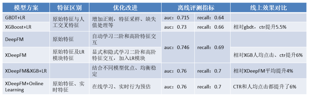 最初我们对比采用了GBDT+LR 和 XGB+LR两种组合方式,XGBoost相比GBDT在模型上做了改进和优化,不论是精度还是效率上都有了提升,从效果数据上,也可以看到auc和召回率指标都有一定的提升,线上点击率也提升了5.5%。