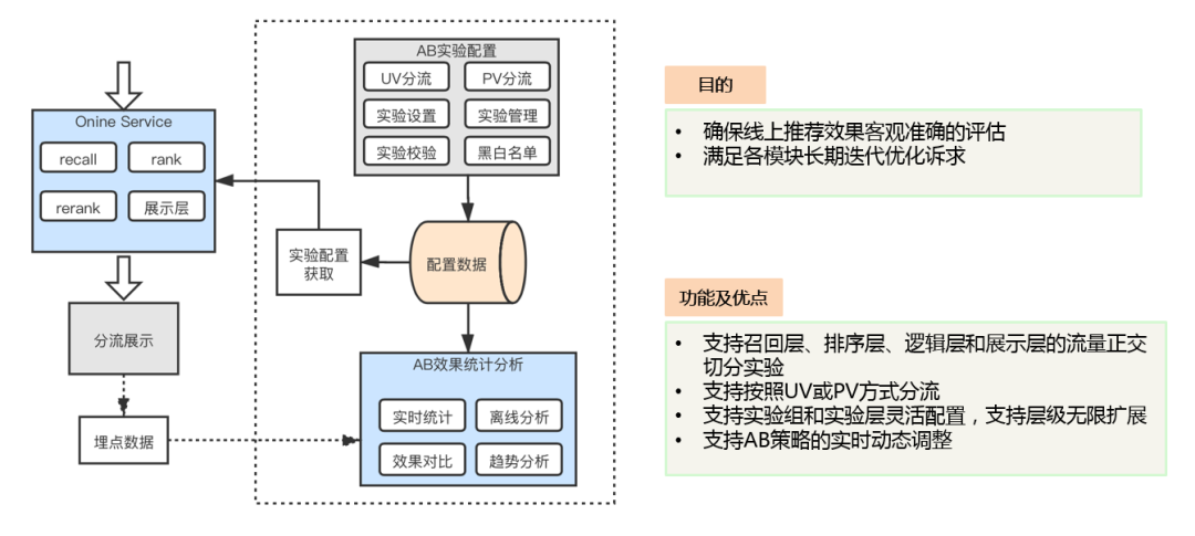 为保证线上推荐效果客观、准确的得到评估,也为了满足推荐各模块长期优化的诉求,我们搭建了ABTest实验平台。