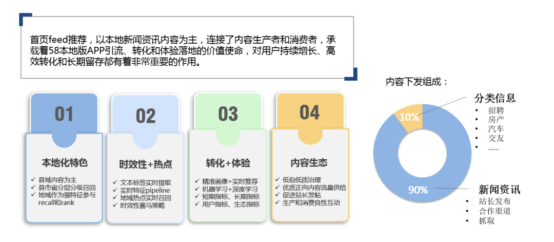 首页Feed,主要以本地新闻资讯内容为主,连接了内容生产者和消费者,承载着58本地版APP引流、转化和体验落地的价值使命,对用户持续增长、高效转化和长期留存有着非常重要的作用。简单说,通过首页Feed推荐的内容吸引力和体验,增加用户的留存和粘性,最终通过分类信息来实现流量变现。
