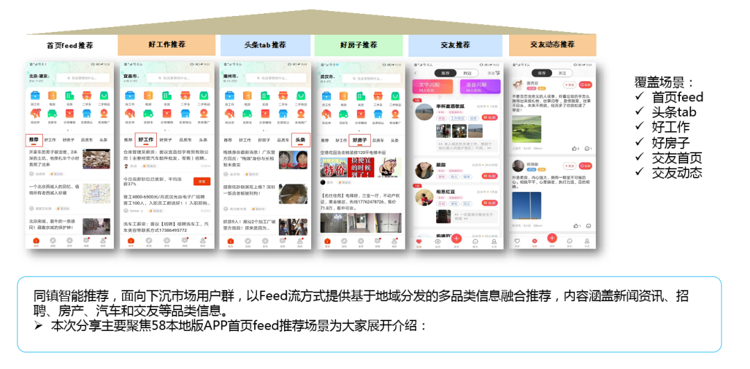 了解了下沉市场,我们看一下同镇是如何利用推荐技术来服务下沉市场用户的。同镇智能推荐,主要面向下沉市场用户群,以Feed流方式提供基于地域分发的多品类信息融合推荐,内容涵盖新闻资讯、招聘、房产、汽车和交友等品类信息。目前同镇推荐流量已经覆盖58本地版APP主要列表的推荐场景,包括首页Feed、好工作、头条tab、好房子、交友、交友动态等等。