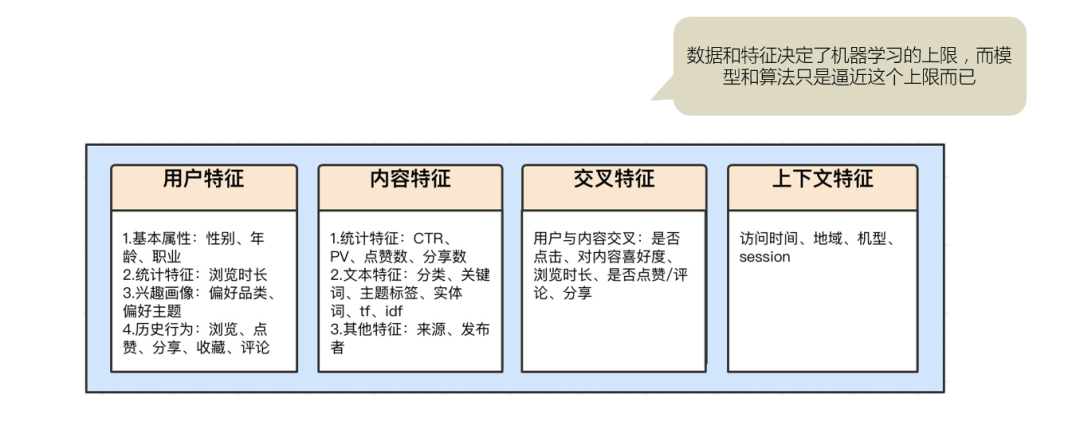 目前用到的特征数据主要包括用户特征、内容特征、交叉特征和上下文特征: