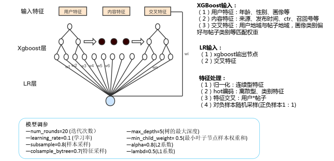 XGB+LR模型结构:相对比较简单,原始输入特征包括三方面:用户特征、内容特征、交叉特征。基于原始特征输入,先用XGBoost模型进行训练得到树的叶子节点 ( 新的交叉特征组合 ),最后把这些新交叉特征加入原有特征中,一起喂给LR模型去训练。