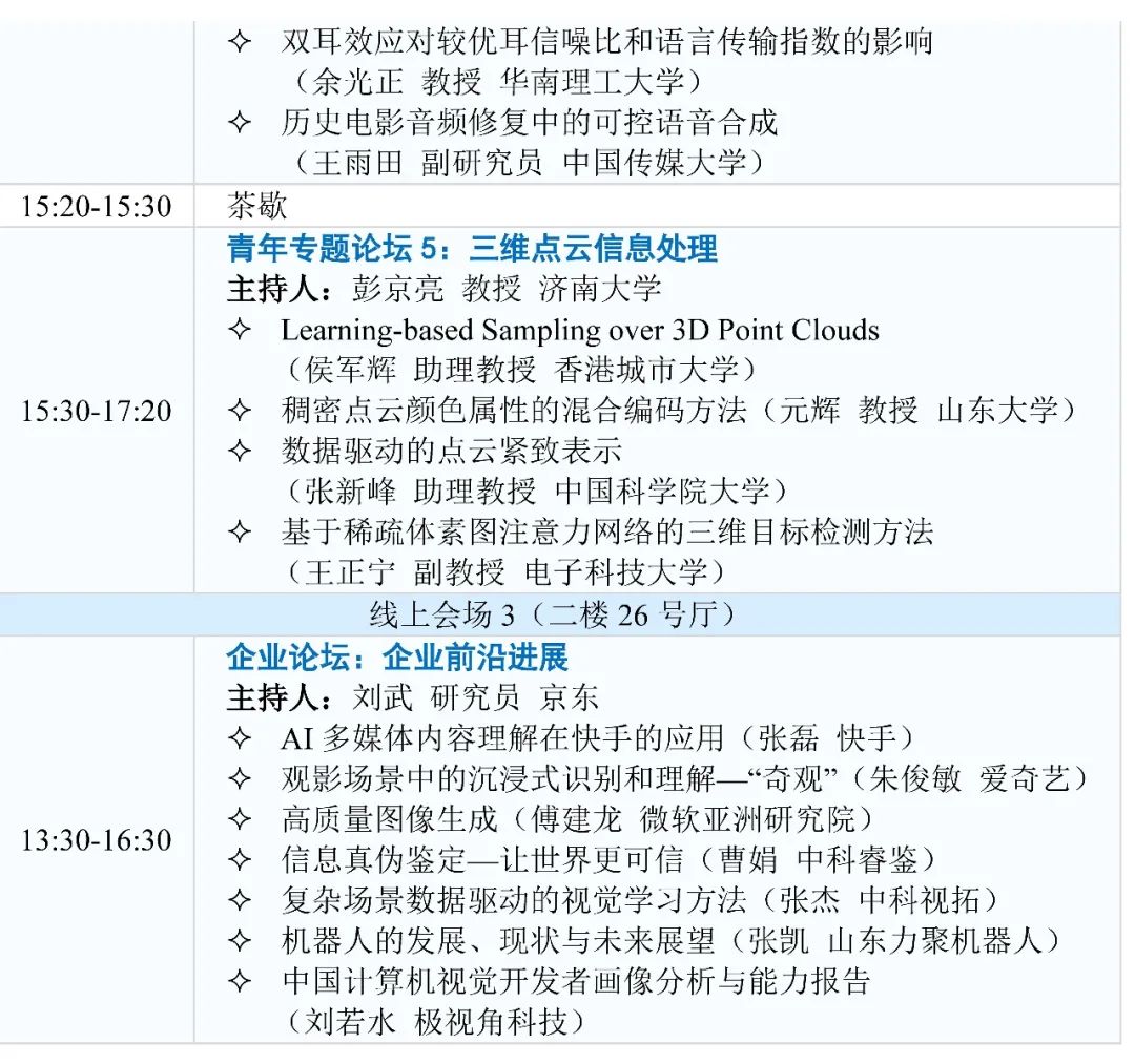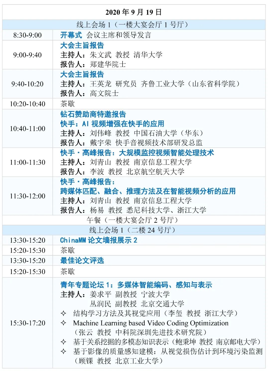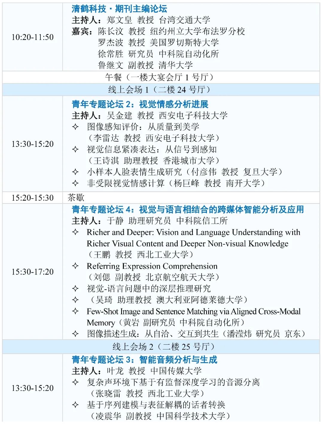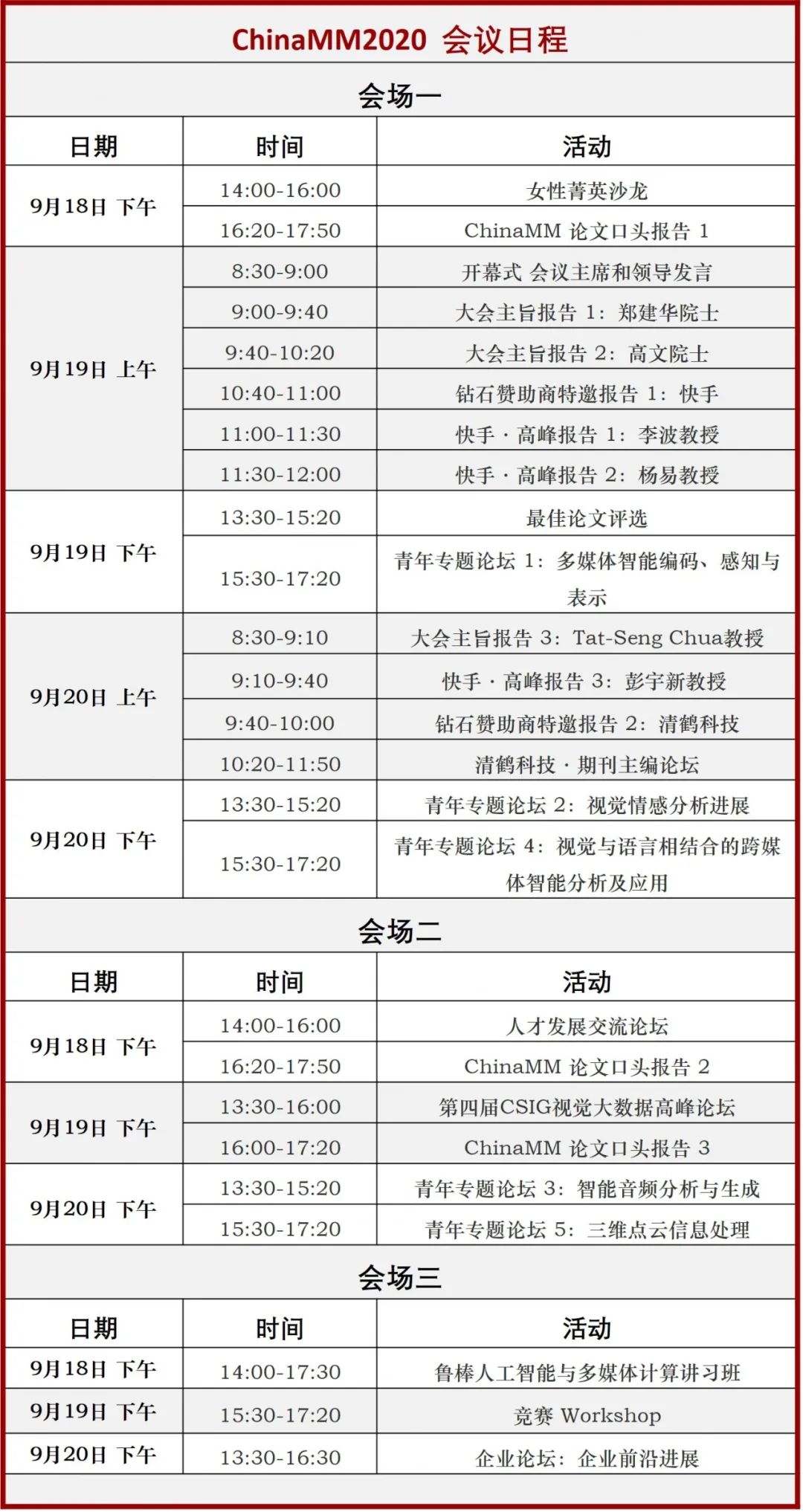 会议期间将组织:学术前沿高峰论坛、青年专题论坛、主编论坛、顶会顶刊论文分享论坛、人才发展交流论坛、女性菁英沙龙、多媒体与机器学习讲习班、企业论坛,等25场高端论坛,为参会者提供丰富的技术盛宴,全方位地扩大交流范畴,创新交流形式,增强交流实效。