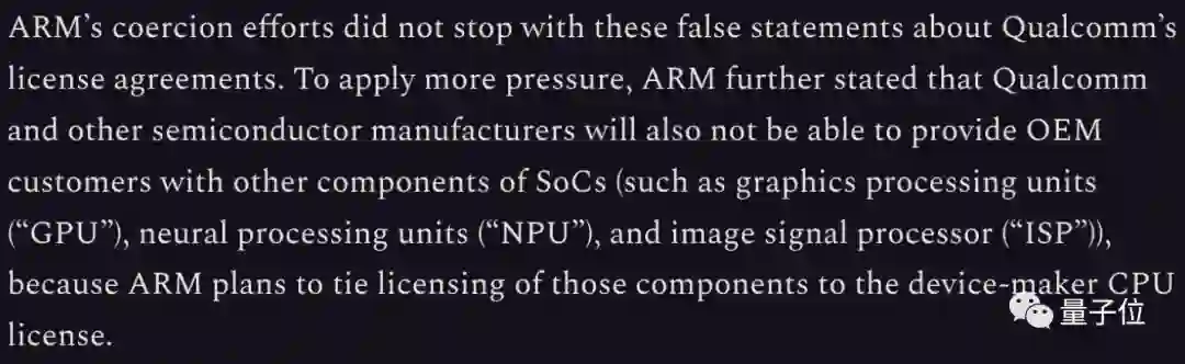 ②Arm表示,高通和其他半导体制造商将无法向OEM客户提供CPU外的其他SoC组件,包括GPU、NPU和ISP等,因为Arm计划将CPU许可证协议与这些组件的许可证协议挂钩。