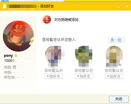 这位男士的QQ是10001,但却拒绝接受好友添加。